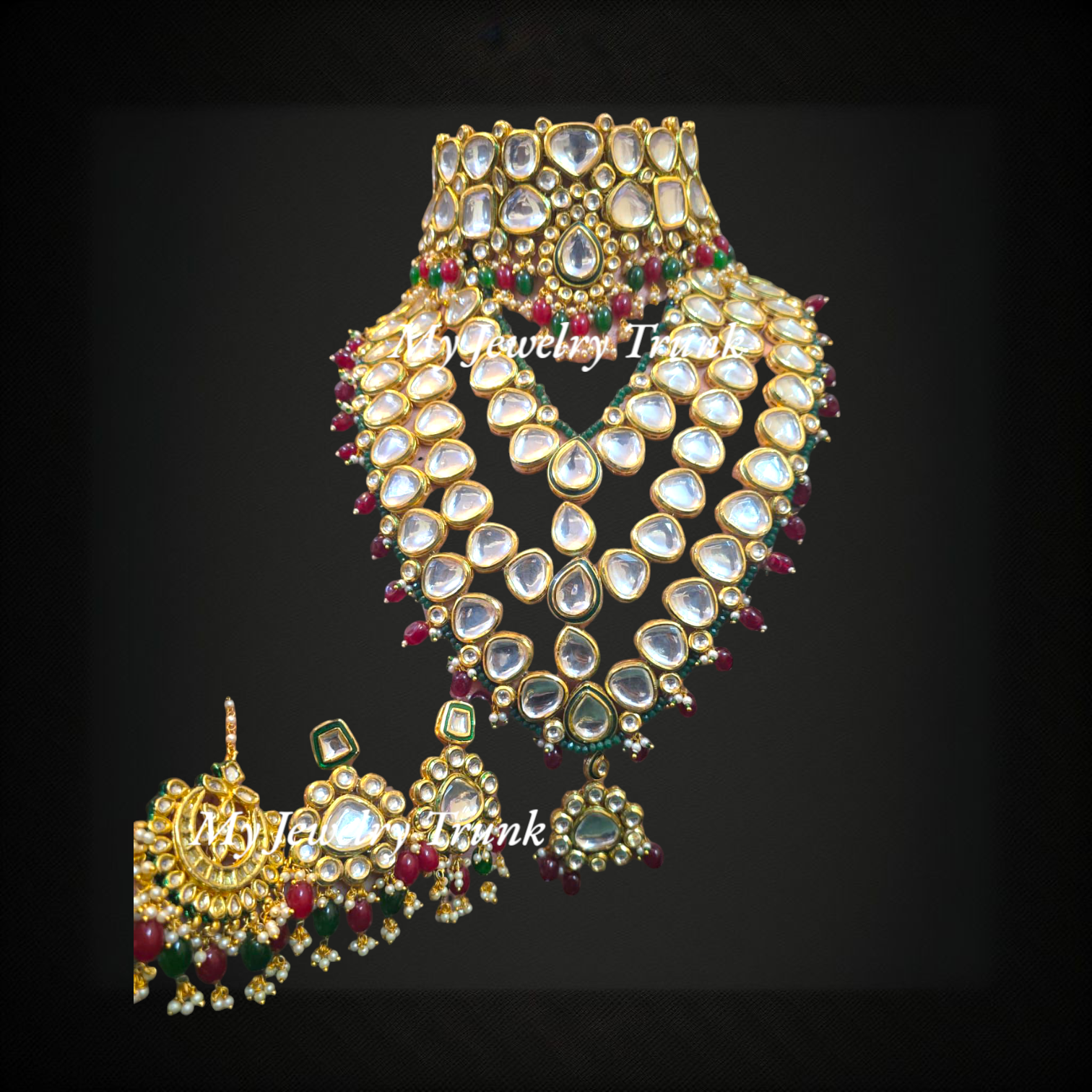 Kundan, pearls, color stone choker & multi layer long necklace with tika.