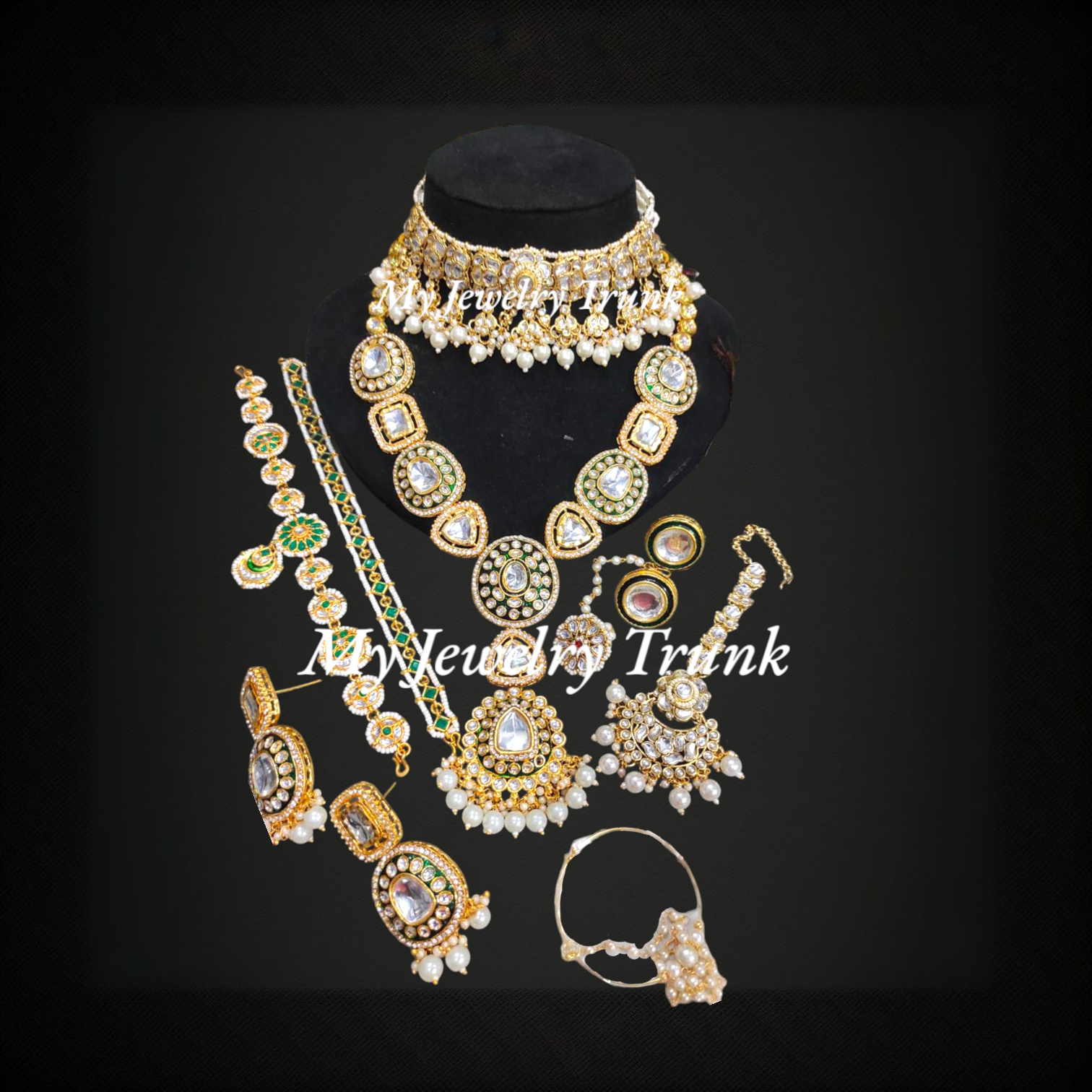 Kundan with pearls choker, long necklace, mathapatti, ring, tika and nose ring bridal set.