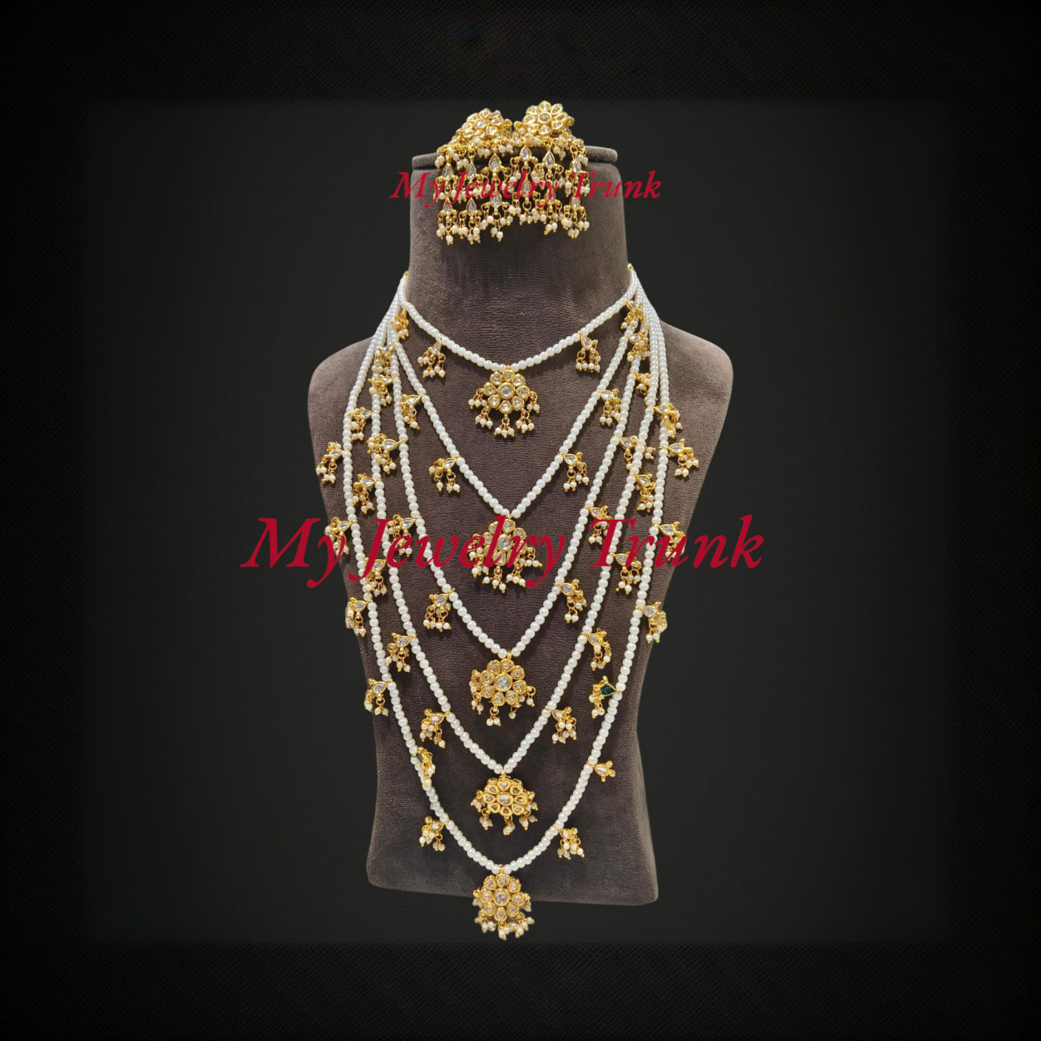 Kundan, pearl with color stone multi layer long necklace.