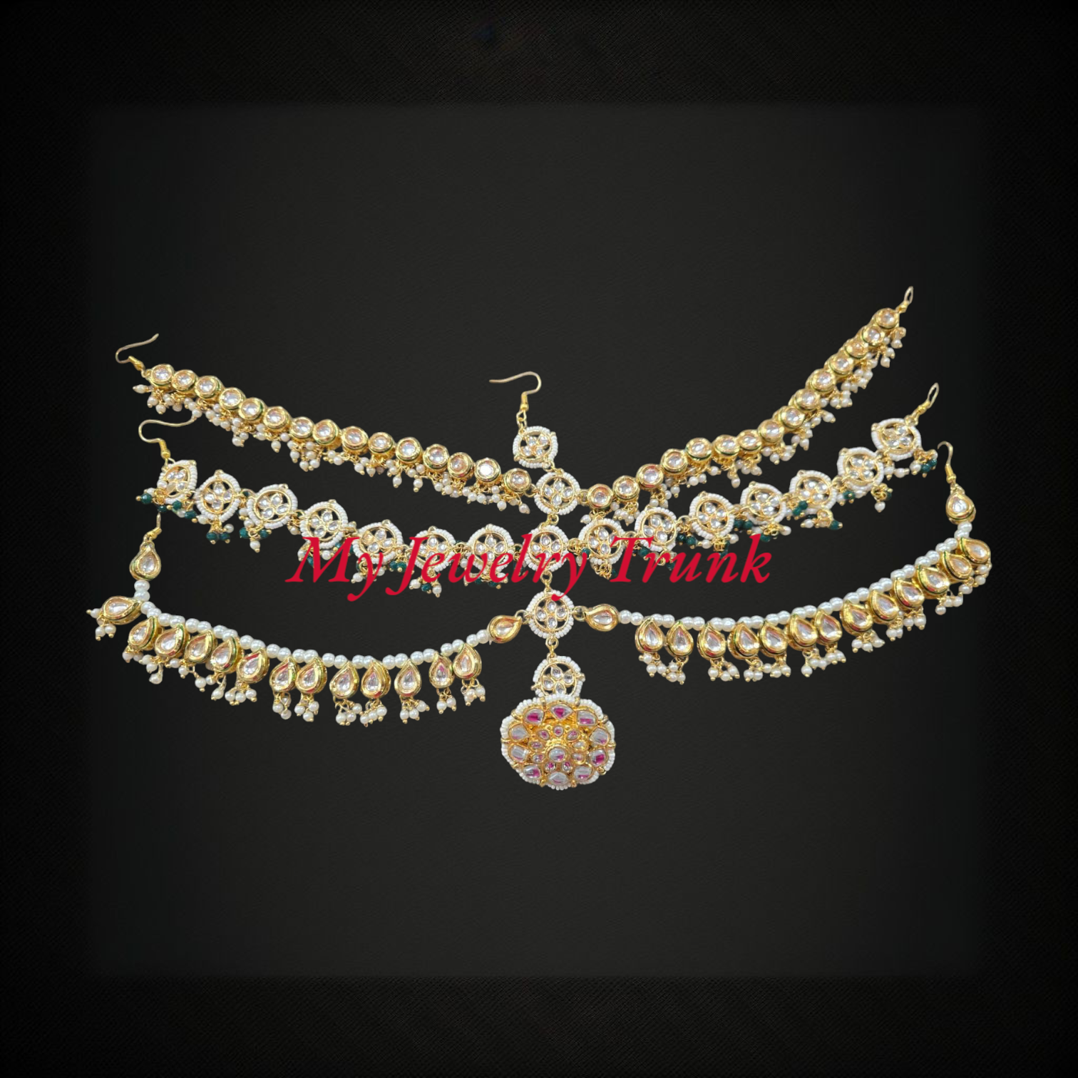 Kundan, pearl with color stone multi layer matahpatti with borla.
