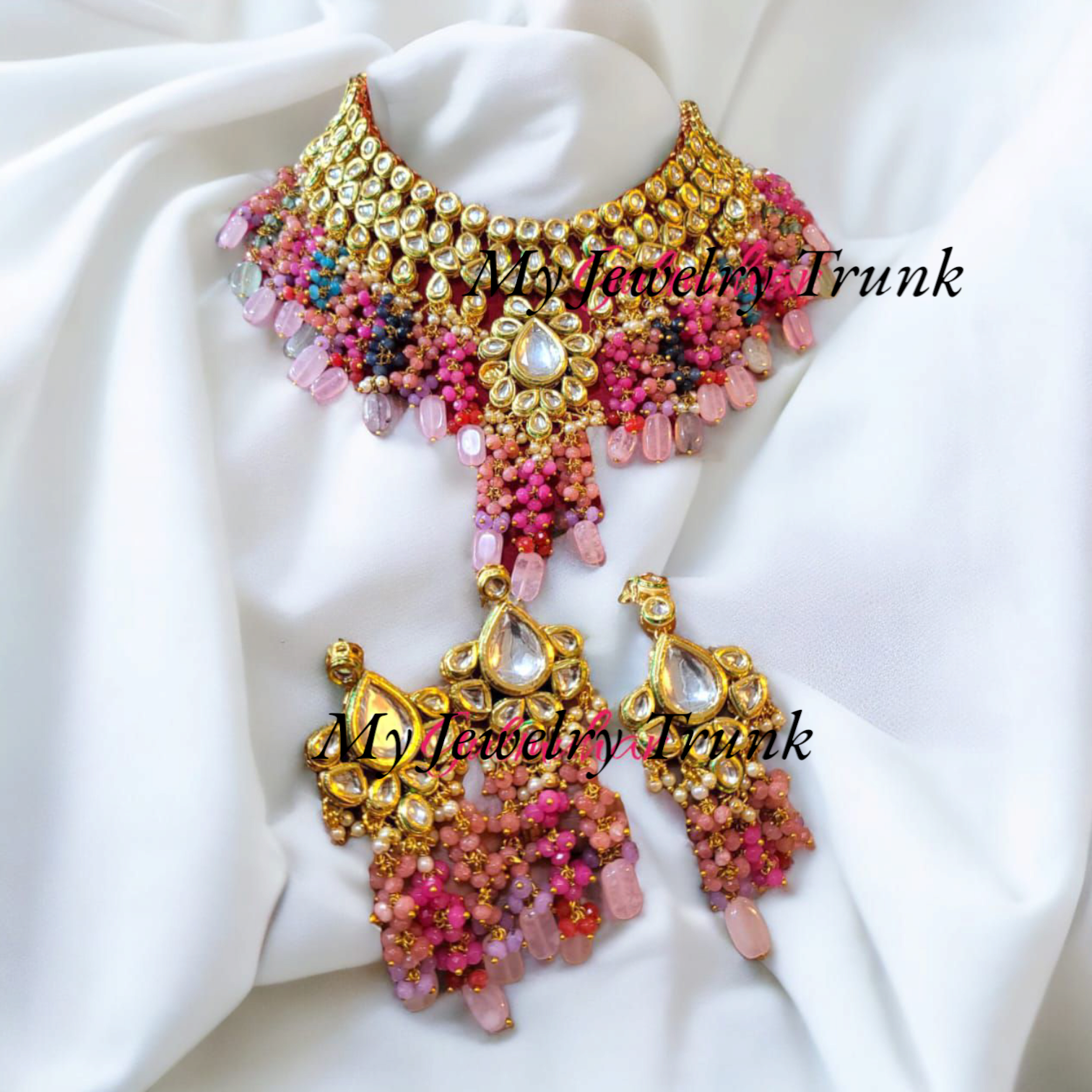 Kundan with color stone designer long necklace with tika.