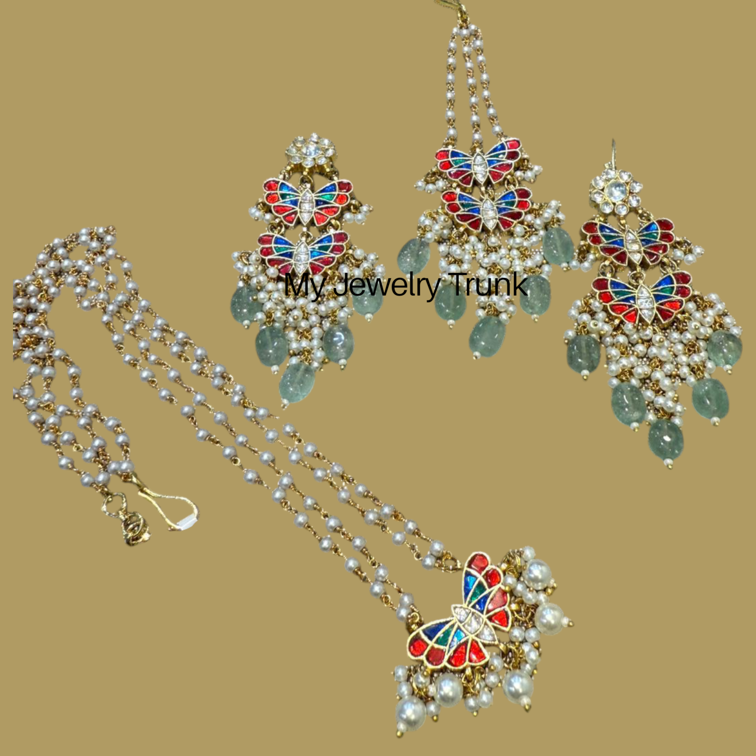Pachi kundan, pearl & color stone chain necklace with tika.