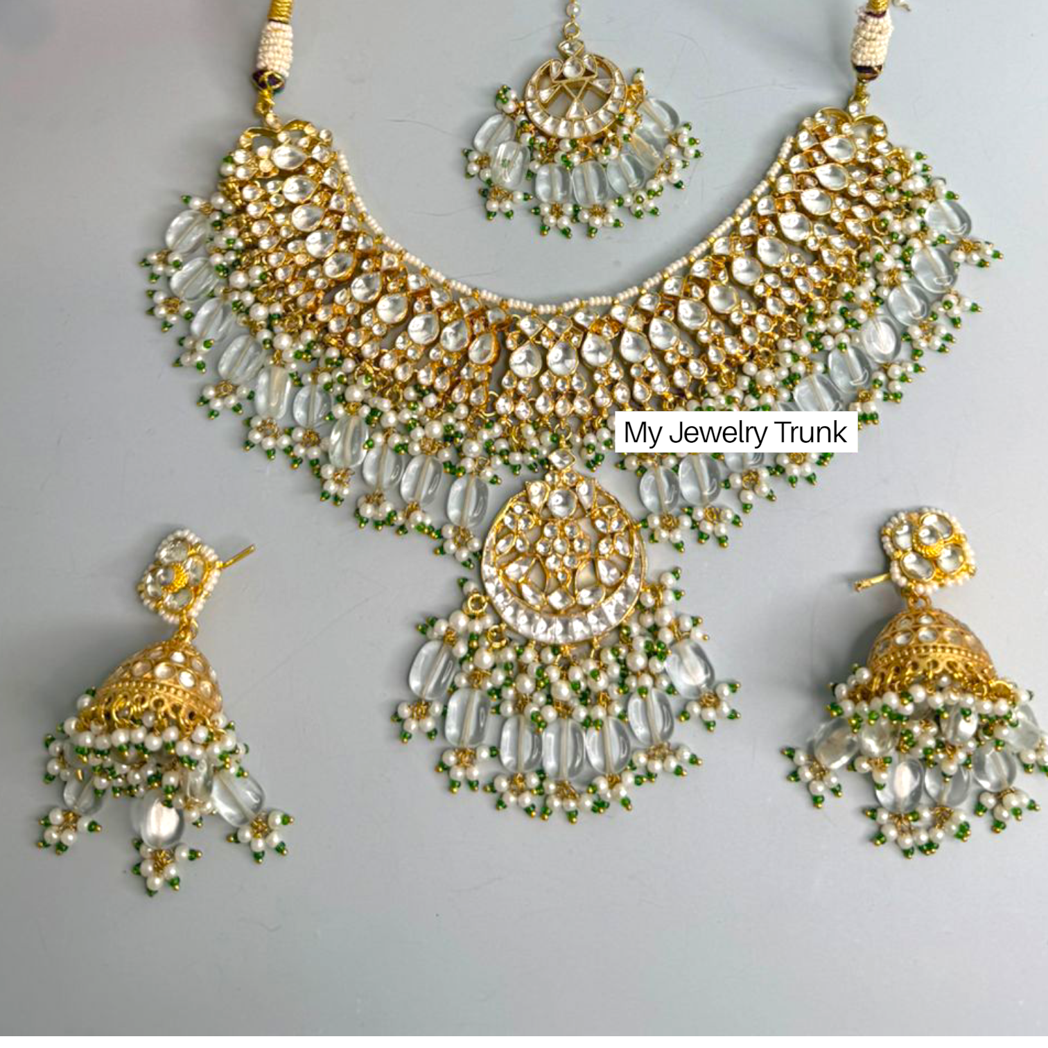 Pachi kundan, color stone & pearls designer necklace with tika.