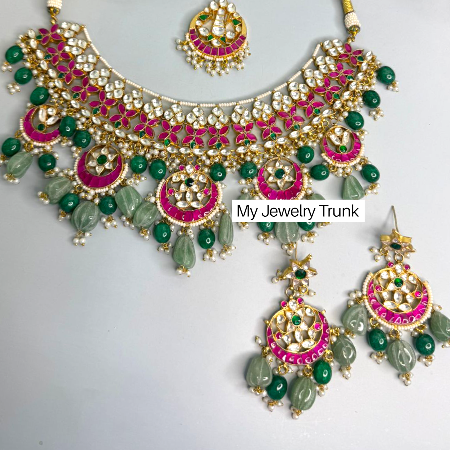 Pachi kundan with color stones & pearls broad designer necklace with tika.
